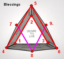 Z) In returning to consider point X, we see that the behavior of the first humans led to the deepening of their wisdom and they began to distinguish between good and evil. But their wisdom, gained in this easy manner and not supported by experience was incomplete, and their will became prone to evil. Linking the design of the ideal " seed" with the rosary (point Y) and the nine blessings of the Lord Jesus (point S) clearly indicates that humans are able to obtain the peaks of Peace, Wisdom and Love. Jesus sets for us the optimal way that can protect us from the workings of evil. The only way to achieve true Wisdom is to take the way not chosen by the first people, the road that leads from Peace through Love. The Lord Jesus emphasizes this by the order of blessings. Referring to the conclusions of point. S and taking into account the order of the blessings we will see that our spiritual journey through life starts from the vertex of the base, where the Desire To Live meets with Truth (vertex-blessing 1). As our journey leads us higher and its aim is to achieve peaks, I will use terms associated with mountaineering to illustrate my points in this discussion. The truth is still an unknown edge to us as we begin our journey. We can only note that it extends at an angle to the top and we can be detached from it because we still do not know how to climb. We start to find the road leading to the mountaintop, so we pass horizontally through Peace taking the way of Order, we hook onto Freedom (2) and guided by Joy we pass through Love to Wisdom, where we carefully follow Prudence and arrive at Truth (3). Therefore, we circumnavigate our mountain and familiarize ourselves with its size and shape while learning how to climb. Next we start to climb following Truth and as we move our spirit to higher peaks, we gain the valley of Justice and Trust (4), which is part of the slope of the Desire for Reciprocity. In continuing our journey we pass through Peace and following Freedom we gain the valley of Respect and Mercy (5), which is part of the slope of the Desire to Help. Persistently following Love we gain the valley of Selflessness and Knowledge (6) belonging to the slope of the Desire to Learn. Following Wisdom we ascend the wall of Peace and climb the edge of Trust to its peak (7). Being at the peak of Peace, the Lord Jesus shows us the way to the summit of Wisdom (8), directing us to the edge of Faith. After following this edge we then follow the edge of Hope and gain the peak of Love (9). This is the last summit we can gain and we are ready to meet God.