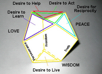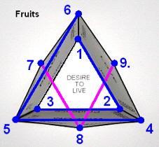 Looking at the "seed" from the bottom we can see all of the vertices. In this way you can also see all of the features at the same time. Visible in the center is the Desire to Live. We can jokingly say that the easiest way to judge us is to look at our goodness from the side of the Desire to Live. This is because you can see the directions in which our features are developing and you can also see the position of the Desires of Action as distinguished by the upper vertices (in the accompanying illustration they are the vertices situated away from the Desire to Live). All of this is a testament to the "volume" of our "seed".